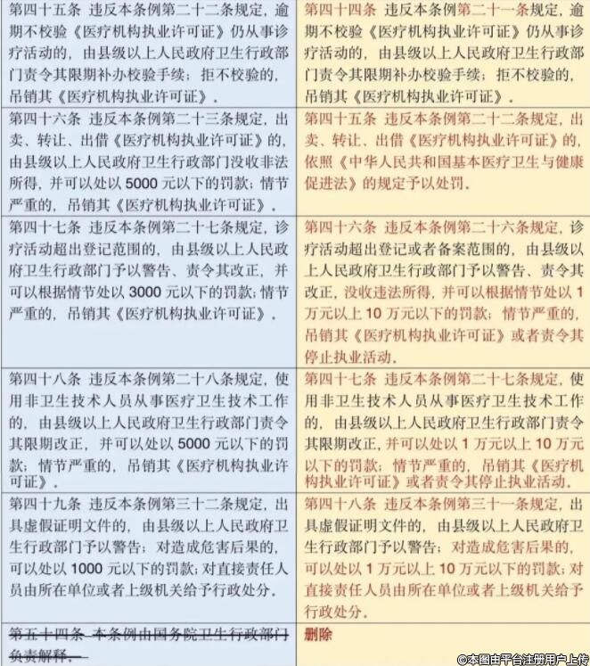 將第四十六條改為第四十五條,修改為”違反本條例第二十二條規(guī)定,出賣、轉(zhuǎn)讓、出借《醫(yī)療機(jī)構(gòu)執(zhí)業(yè)許可證》的,依照《中華人民共和國(guó)基本醫(yī)療衛(wèi)生與健康促進(jìn)法》的規(guī)定予以處罰。“