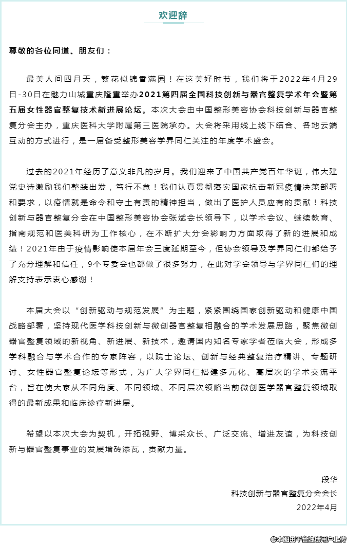 2022.4.29-30 重慶 2021第四屆全國科技創(chuàng)新與器官整復(fù)學(xué)術(shù)年會暨第五屆女性器官整復(fù)新進展論壇通知