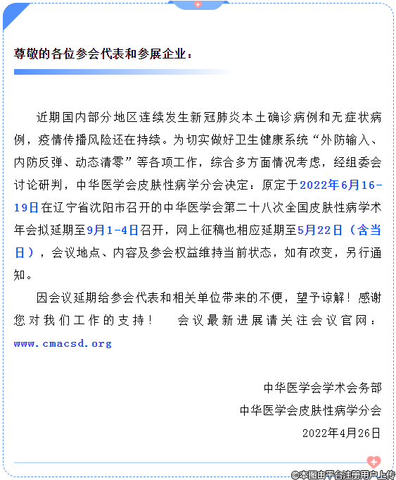 因受疫情影響,原定于2022年6月16-19日在遼寧省沈陽(yáng)市召開的中華醫(yī)學(xué)會(huì)第二十八次全國(guó)皮膚性病學(xué)術(shù)年會(huì)擬延期至9月1-4日召開。,網(wǎng)上征稿也相應(yīng)延期至5月22日(含當(dāng)日)。