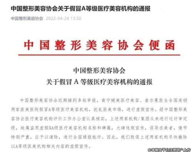 2022年4月24日,中國整形美容協(xié)會發(fā)布消息,南寧媛美醫(yī)療美容、查爾曼醫(yī)生全國連鎖兩家醫(yī)美醫(yī)院假冒A等級醫(yī)療美容機(jī)構(gòu),擾亂醫(yī)美市場,進(jìn)行虛假宣傳。經(jīng)中國整形美容協(xié)會醫(yī)療美容機(jī)構(gòu)評價工作辦公室認(rèn)真核實(shí),上述兩家機(jī)構(gòu)/集團(tuán)從未進(jìn)行過評審定級,純屬盜用虛假5A級醫(yī)療美容機(jī)構(gòu)名稱和牌匾,大肆違規(guī)宣傳,誤導(dǎo)求美者,情節(jié)特別嚴(yán)重,應(yīng)予以清除,進(jìn)行全國通報批評。