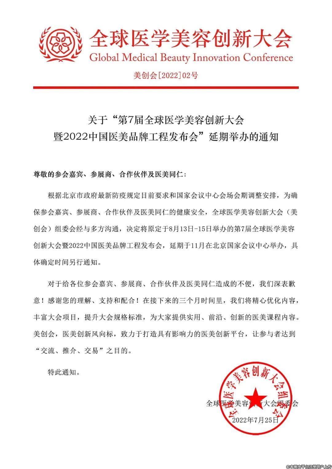根據(jù)北京市政府最新防疫規(guī)定目前要求和國(guó)家會(huì)議中心會(huì)場(chǎng)會(huì)期調(diào)整安排,為確保參會(huì)嘉賓、參展商、合作伙伴及醫(yī)美同仁的健康安全,全球醫(yī)學(xué)美容創(chuàng)新大會(huì)(美創(chuàng)會(huì))組委會(huì)經(jīng)與多方溝通,決定將原定于8月13日-15日舉辦的第7屆全球醫(yī)學(xué)美容創(chuàng)新大會(huì)暨2022中國(guó)醫(yī)美品牌工程發(fā)布會(huì),延期于11月在北京國(guó)家會(huì)議中心舉辦,具體確定時(shí)間另行通知。
