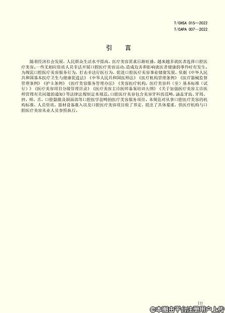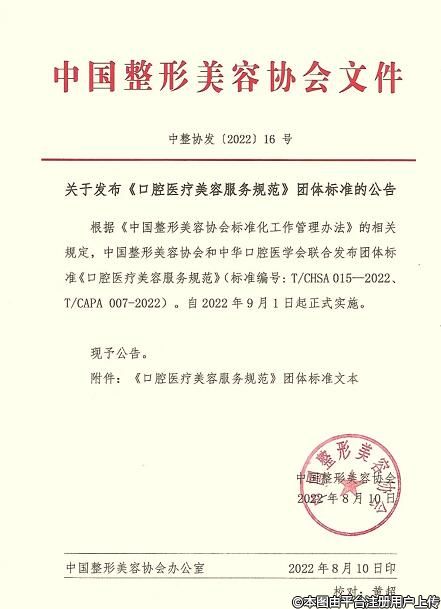 8月10日,中國整形美容協(xié)會和中華口腔醫(yī)學(xué)會聯(lián)合發(fā)布團(tuán)體標(biāo)準(zhǔn)《口腔醫(yī)療美容服務(wù)規(guī)范》(標(biāo)準(zhǔn)編號: T/CHSA 015—2022、T/CAPA 007-2022)。此標(biāo)準(zhǔn)系根據(jù)《中國整形美容協(xié)會標(biāo)準(zhǔn)化工作管理辦法》的相關(guān)規(guī)定編寫,將從2022年9月1日起正式實施?!犊谇会t(yī)療美容服務(wù)規(guī)范》團(tuán)體標(biāo)準(zhǔn)內(nèi)容如下: