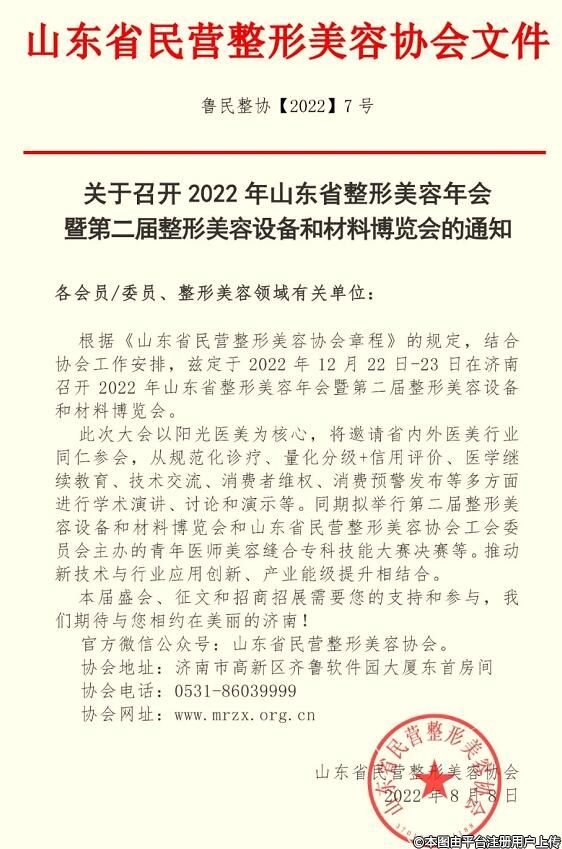 根據(jù)《山東省民營整形美容協(xié)會章程》的規(guī)定,結(jié)合協(xié)會工作安排,茲定于2022年12月 22日-23日在濟南召開2022年山東省整形美容年會暨第二屆整形美容設(shè)備和材料博覽會。