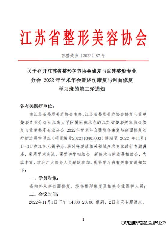 由江蘇省整形美容協(xié)會(huì)主辦、江蘇省整形美容協(xié)會(huì)修復(fù)與重建整形專業(yè)分會(huì)及江南大學(xué)附屬醫(yī)院承辦的江蘇省整形美容協(xié)會(huì)修復(fù)與重建整形專業(yè)分會(huì)2022年學(xué)術(shù)年會(huì)暨燒傷康復(fù)與創(chuàng)面修復(fù)治療新進(jìn)展學(xué)習(xí)班(項(xiàng)目編號(hào)2022710403003)延期至2022 年11月1日-3日在江蘇無(wú)錫舉辦。屆時(shí)將邀請(qǐng)相關(guān)領(lǐng)域多名專家進(jìn)行專題講座,采用學(xué)術(shù)交流、課堂講學(xué)相結(jié)合,新技術(shù)與新進(jìn)展相結(jié)合,內(nèi)容豐富,歡迎廣大醫(yī)務(wù)人員踴躍參加。現(xiàn)將學(xué)習(xí)班有關(guān)事宜通知如下: