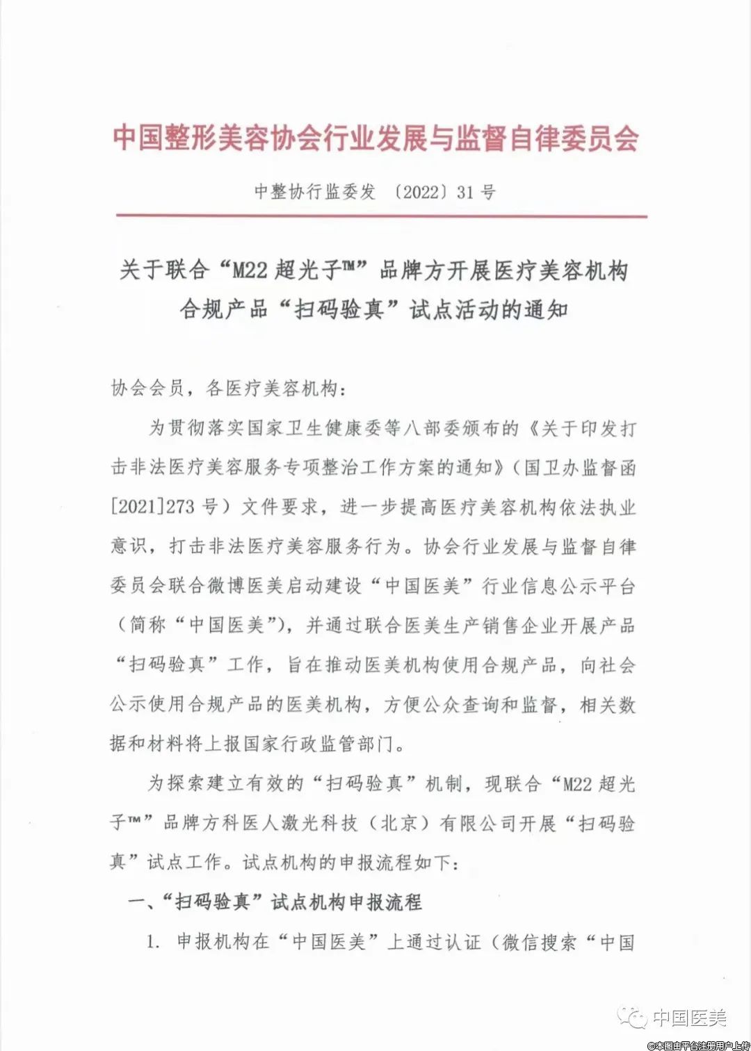 關(guān)于聯(lián)合“M22超光子?”品牌方開展醫(yī)療美容機構(gòu)合規(guī)產(chǎn)品“掃碼驗真”試點活動的通知
