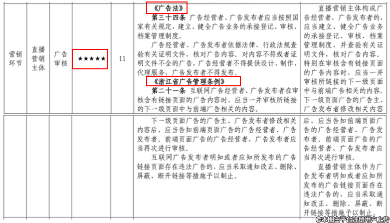 內(nèi)容概括:第11點(diǎn)主要介紹廣告審核的相關(guān)情況,根據(jù)《廣告法》《浙江省廣告管理?xiàng)l例》的相關(guān)條例,直播營(yíng)銷主體應(yīng)該嚴(yán)格按照要求發(fā)布相關(guān)內(nèi)容,針對(duì)互聯(lián)網(wǎng)一級(jí)頁(yè)面、二級(jí)頁(yè)面全部審核,如果發(fā)現(xiàn)明顯違規(guī)行為應(yīng)該當(dāng)采取通知改正、刪除、屏蔽、斷開(kāi)鏈接等措施予以制止。