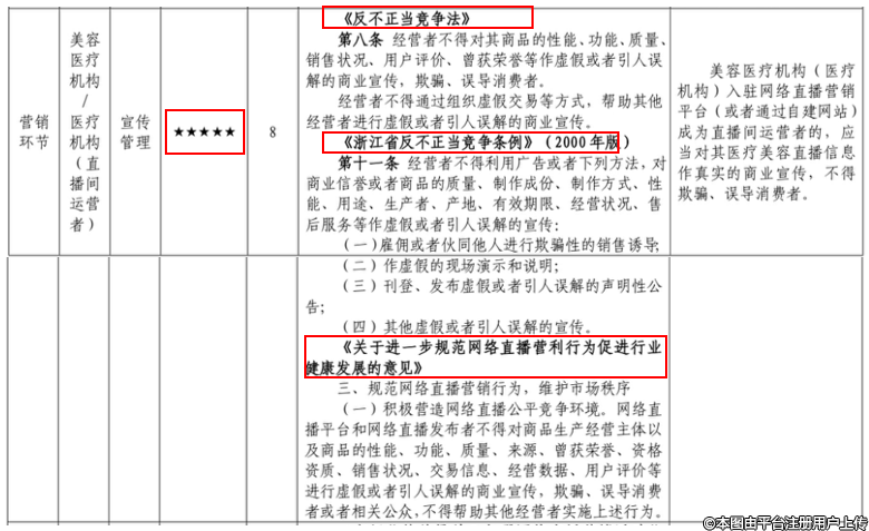 內(nèi)容概括:第8點(diǎn)主要表達(dá)宣傳管理的涉及范圍,舉例,國(guó)家《反不正當(dāng)競(jìng)爭(zhēng)法》及《浙江省反不正當(dāng)競(jìng)爭(zhēng)條例》(2000年版)的詳細(xì)條款進(jìn)行說(shuō)明及相關(guān)約束。同時(shí),強(qiáng)調(diào)《關(guān)于進(jìn)一步規(guī)范網(wǎng)絡(luò)直播營(yíng)利行為促進(jìn)行業(yè)健康發(fā)展的意見(jiàn)》雙重要求,確保醫(yī)美直播信息作真實(shí)的商業(yè)宣傳,不得欺騙、誤導(dǎo)消費(fèi)者。