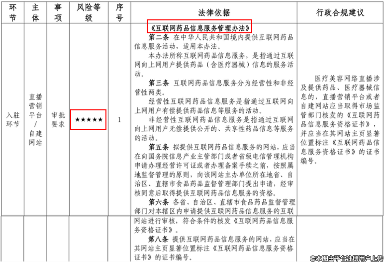內(nèi)容概括:第1條主要表述,醫(yī)美機(jī)構(gòu)如果做直播涉及到藥品、醫(yī)療器械信息,無(wú)論自建平臺(tái)還是入駐平臺(tái),首先需要取得市場(chǎng)監(jiān)管部門的《互聯(lián)網(wǎng)藥品信息服務(wù)資格證書(shū)》后并在顯著部位標(biāo)準(zhǔn)證書(shū)編號(hào)方便消費(fèi)者查看。