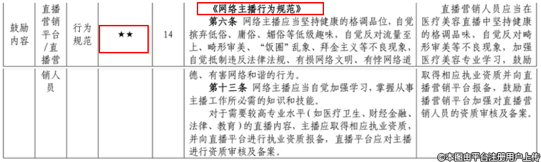 內(nèi)容概括:第14點(diǎn)主要強(qiáng)調(diào)加強(qiáng)主播的行為規(guī)范,針對(duì)較高專業(yè)水平(如醫(yī)療衛(wèi)生、財(cái)經(jīng)金融、法律、教育)的直播內(nèi)容,主播應(yīng)取得相應(yīng)執(zhí)業(yè)資質(zhì),鼓勵(lì)直播營(yíng)銷平臺(tái)加強(qiáng)對(duì)直播營(yíng)銷人員的資質(zhì)審核及備案。