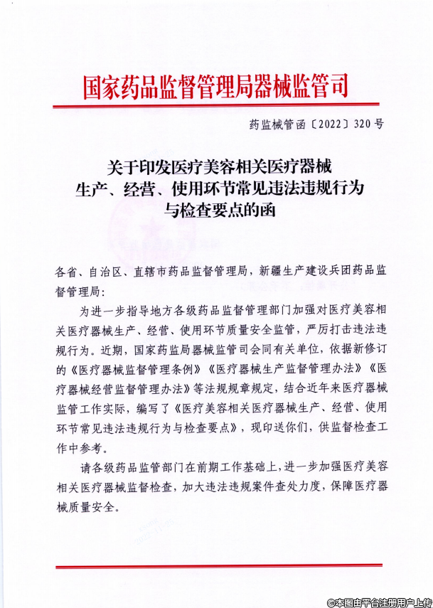 國藥監(jiān)局印發(fā)《醫(yī)療美容相關(guān)醫(yī)療器械生產(chǎn)、經(jīng)營、使用環(huán)節(jié)常見違法違規(guī)行為與檢查要點》