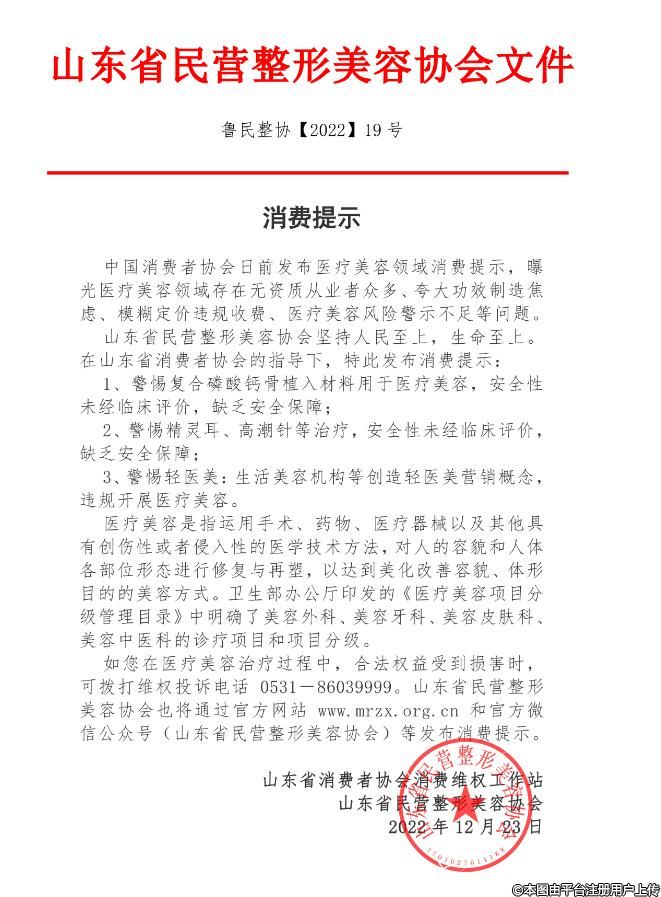 在山東省消費(fèi)者協(xié)會的指導(dǎo)下,山東省民營整形美容協(xié)會發(fā)布了消費(fèi)提示: