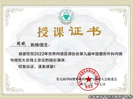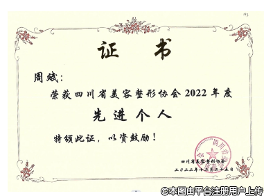 為表彰周斌院長(zhǎng)在“2022年世界內(nèi)鏡醫(yī)師協(xié)會(huì)第九屆中國(guó)整形外科內(nèi)鏡與微創(chuàng)大會(huì)線(xiàn)上會(huì)議的”精彩演講,第九屆中國(guó)整形外科內(nèi)鏡與微創(chuàng)大會(huì)組委會(huì)為周斌院長(zhǎng)頒發(fā)了授課證書(shū),四川省整形美容協(xié)會(huì)為周斌院長(zhǎng)頒發(fā)了“2022年度先進(jìn)個(gè)人”的榮譽(yù)證書(shū)。