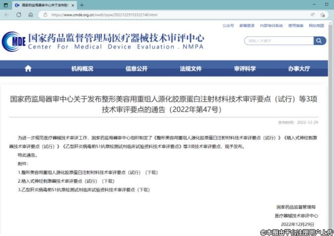 國家藥監(jiān)局器審中心發(fā)布整形美容用重組人源化膠原蛋白注射材料技術審評要點(試行)