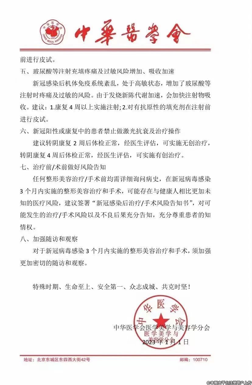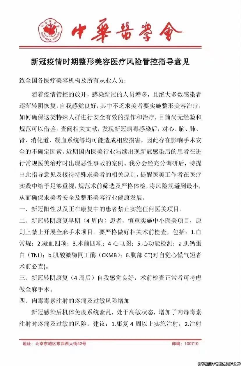 近日,中華醫(yī)學(xué)會醫(yī)美分會發(fā)給全國醫(yī)美機構(gòu)及所有從業(yè)人員的《新冠疫情時期整形美容醫(yī)療風(fēng)險管控指導(dǎo)意見》提出,“新冠陽性以及正在康復(fù)中的患者禁止實施任何醫(yī)美項目”;新冠轉(zhuǎn)陰康復(fù)早期(4周內(nèi))患者,慎重實施中小醫(yī)美項目,原則上禁止開展全麻手術(shù)項目。