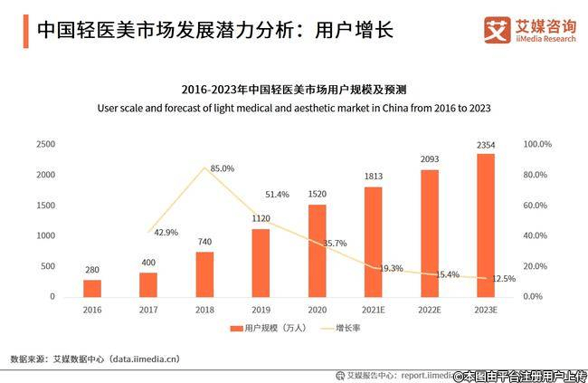 艾媒咨詢《2021年中國輕醫(yī)美行業(yè)研究及產業(yè)鏈分析報告》數(shù)據(jù)顯示,2020年中國非手術類醫(yī)美市場規(guī)模為545億元,預計2021年市場規(guī)模將增至798億元,在未來幾年中輕醫(yī)美占比不斷增大;2020年輕醫(yī)美用戶規(guī)模達1520萬,預計到2021年將達到1813萬。艾媒咨詢分析師認為,輕醫(yī)美因其創(chuàng)傷小、風險低、單價低等優(yōu)勢,對比手術類醫(yī)美將具有更高的市場接受度和復購率,用戶規(guī)模的持續(xù)增長,表明中國輕醫(yī)美市場呈現(xiàn)快速發(fā)展趨勢,將會成為未來推動醫(yī)美行業(yè)增長的主要動力。
