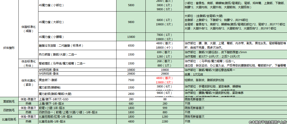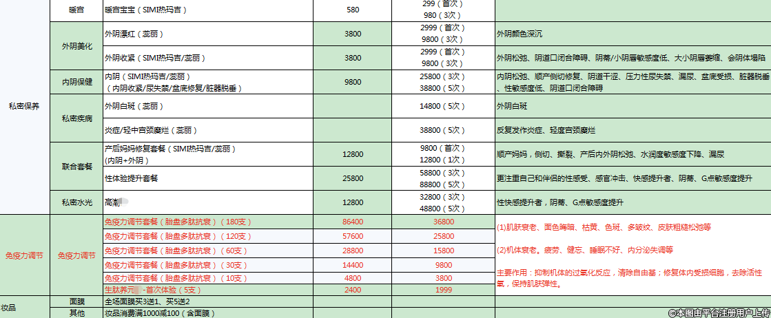 7、緊膚維養(yǎng)類:(1)深藍緊膚面部年卡-12次 4800;(2)熱拉提全模式3次 4999;(3)BTL魔力射頻面部年卡-12次 15800;(4)FOTONA 4D眼部/頸部/面部3次 9800/12800/12800