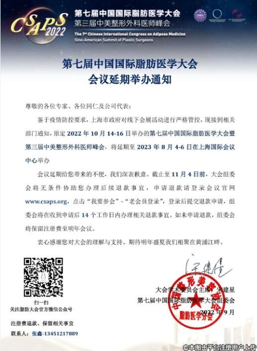 會議延期舉辦通知 第七屆中國國際脂肪醫(yī)學(xué)大會