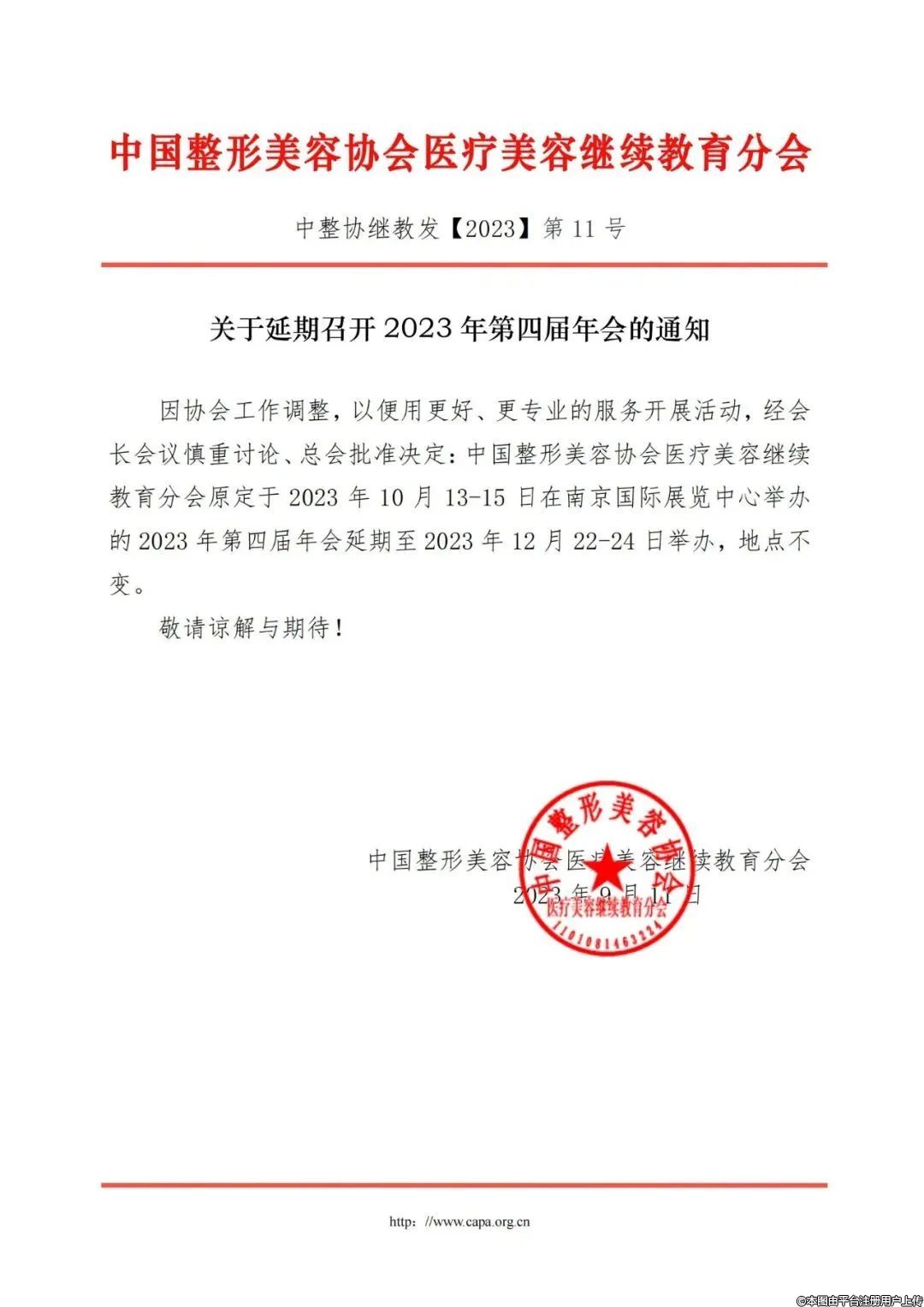 因協(xié)會工作調(diào)整,以便用更好、更專業(yè)的服務(wù)開展活動,經(jīng)會長會議慎重討論、總會批準決定:中國整形美容協(xié)會醫(yī)療美容繼續(xù)教育分會原定于2023年10月13日-15日在南京國際展覽中心舉辦的2023年第四屆年會延期至2023年12月22日-24日舉辦,地點不變。