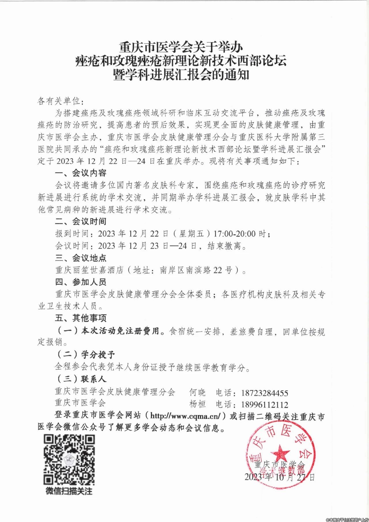 為搭建痤瘡及玫瑰痤瘡領(lǐng)域科研和臨床互動(dòng)交流平臺(tái),推動(dòng)痤瘡及玫瑰痤瘡的防治研究,提高患者的預(yù)后效果,實(shí)現(xiàn)更全面的皮膚健康管理,由重慶市醫(yī)學(xué)會(huì)主辦,重慶市醫(yī)學(xué)會(huì)皮膚健康管理分會(huì)與重慶醫(yī)科大學(xué)附屬第三醫(yī)院共同承辦的“痤瘡和玫瑰痤瘡新理論新技術(shù)西部論壇暨學(xué)科進(jìn)展匯報(bào)會(huì)”定于2023年12月22日—24日在重慶舉辦。