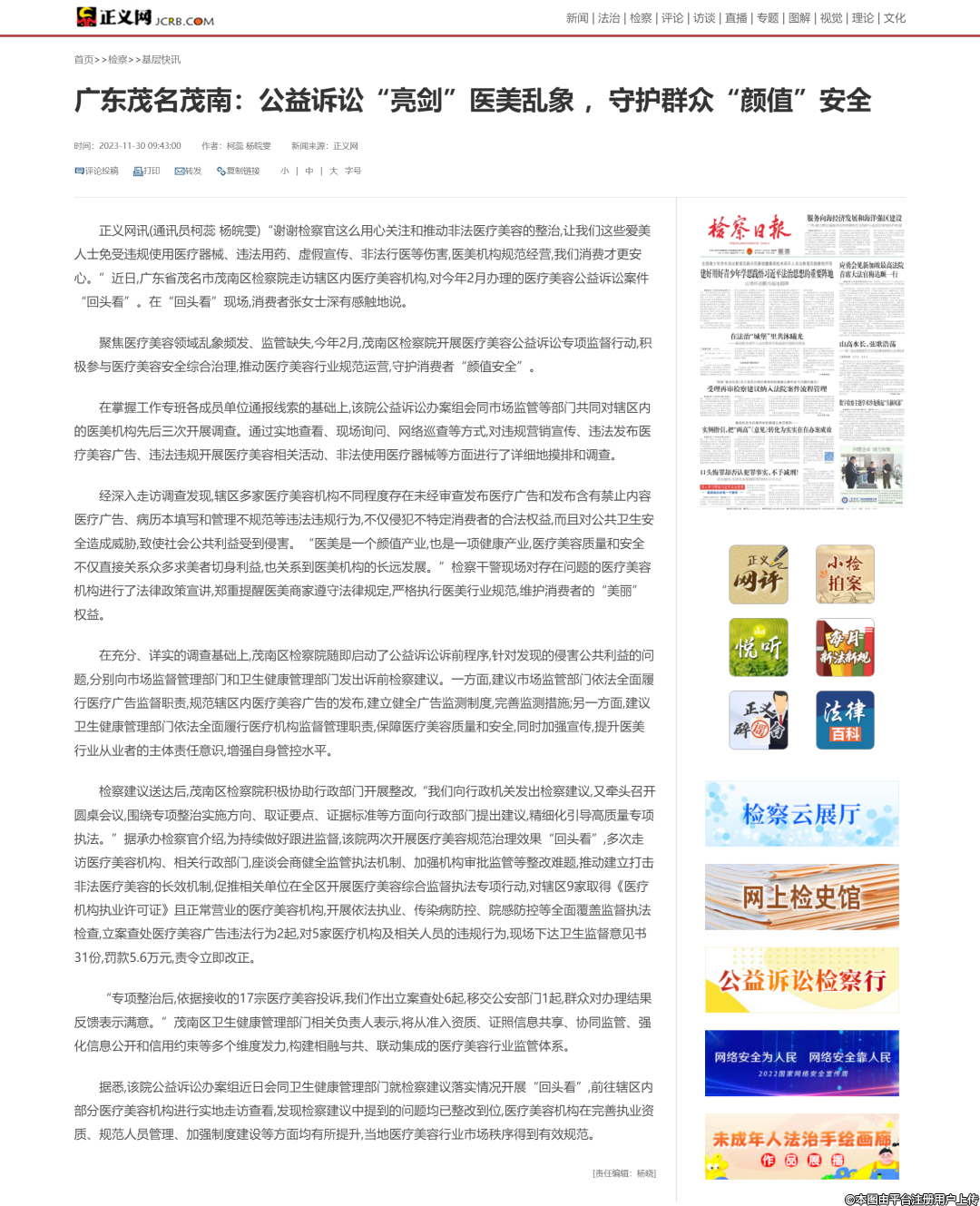 11月30日,正義網(wǎng)以《廣東茂名茂南:公益訴訟“亮劍”醫(yī)美亂象 ,守護群眾“顏值”安全》為題,報道了茂南區(qū)人民檢察院“開展醫(yī)療美容公益訴訟專項監(jiān)督行動”工作做法。原文如下: