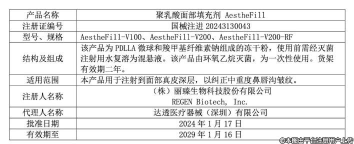 AestheFill產(chǎn)品為韓國知名醫(yī)美企業(yè)REGENBiotech,Inc.研發(fā)的一款“醫(yī)美再生注射劑”,由PDLLA微球和羧甲基纖維素鈉組成。該產(chǎn)品于2014年首次在韓國獲批上市,截至目前已在全球60余個國家和地區(qū)上市銷售。