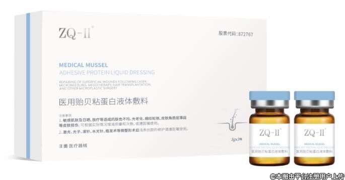 ZQ-II醫(yī)用貽貝粘蛋白液體敷料(頭皮抗衰小藍(lán)帽),II類醫(yī)療器械,專為頭皮抗衰研制。采用美塑療法達(dá)到改善頭皮微環(huán)境、修護(hù)毛囊、固發(fā)、密發(fā)、防脫發(fā)等頭皮抗衰效果。適用于頭皮屏障受損、發(fā)癢、泛紅、脫發(fā)、頭皮抗衰/改善和植發(fā)治療前后的人群;同時,適用于非慢性創(chuàng)面(如淺表性創(chuàng)面、小創(chuàng)口、擦傷、曬傷、微整形及植發(fā)術(shù)后創(chuàng)面等)的覆蓋和護(hù)理。其核心成分貽貝粘蛋白是提取自海洋貽貝(亦稱海虹、青口或淡菜)足絲腺中的一種高活性蛋白質(zhì)。因其足絲蛋白的分泌量極低,1萬只貽貝中僅能提取1mg的粘附蛋白,被譽(yù)為“深海軟黃金“,價格昂貴。具有抗炎鎮(zhèn)靜、修復(fù)創(chuàng)面的功效。