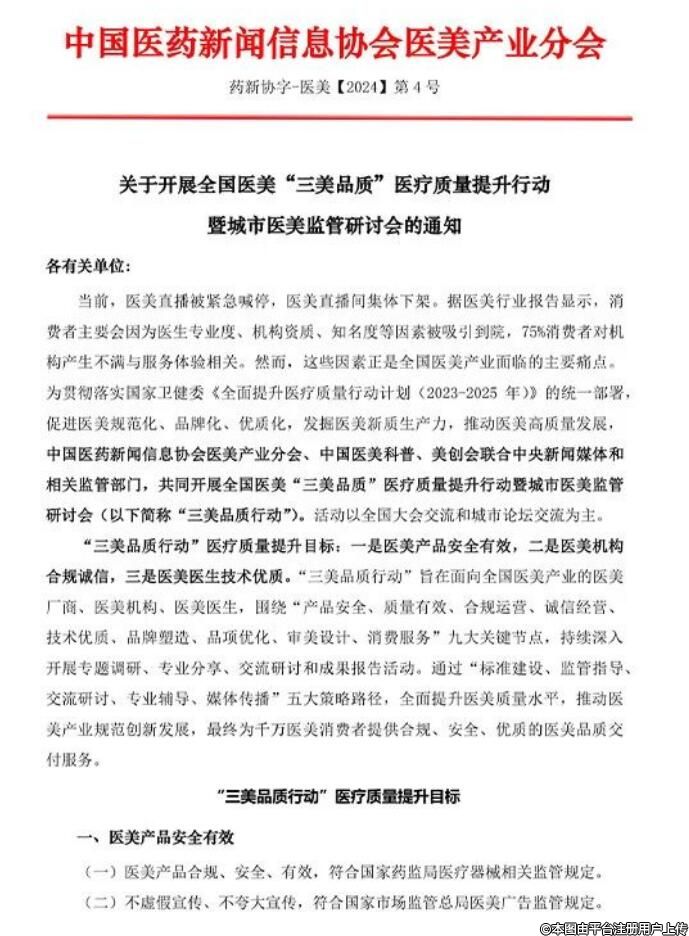 當(dāng)前,醫(yī)美直播被緊急喊停,醫(yī)美直播間集體下架。據(jù)醫(yī)美行業(yè)報告顯示,消費者主要會因為醫(yī)生專業(yè)度、機構(gòu)資質(zhì)、知名度等因素被吸引到院,75%消費者對機構(gòu)產(chǎn)生不滿與服務(wù)體驗相關(guān)。然而,這些因素正是全國醫(yī)美產(chǎn)業(yè)面臨的主要痛點。為貫徹落實國家衛(wèi)健委《全面提升醫(yī)療質(zhì)量行動計劃(2023-2025年)》的統(tǒng)一部署,促進(jìn)醫(yī)美規(guī)范化、品牌化、優(yōu)質(zhì)化,發(fā)掘醫(yī)美新質(zhì)生產(chǎn)力,推動醫(yī)美高質(zhì)量發(fā)展,中國醫(yī)藥新聞信息協(xié)會醫(yī)美產(chǎn)業(yè)分會、中國醫(yī)美科普、美創(chuàng)會聯(lián)合中央新聞媒體和相關(guān)監(jiān)管部門,共同開展全國醫(yī)美“三美品質(zhì)醫(yī)療質(zhì)量提升行動暨城市醫(yī)美監(jiān)管研討會(以下簡稱“三美品質(zhì)行動”)。
