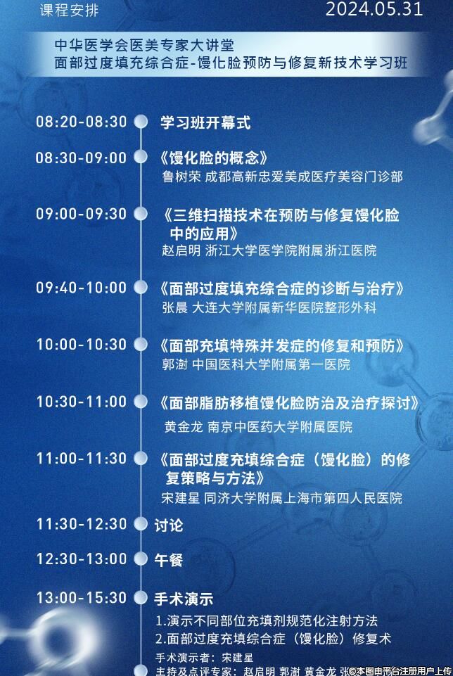 *“中華醫(yī)學(xué)會(huì)醫(yī)美專家大講堂暨中華醫(yī)學(xué)會(huì)第十九次醫(yī)學(xué)美容學(xué)術(shù)大會(huì)(會(huì)前會(huì))——面部過度充填綜合癥饅化臉預(yù)防與修復(fù)新技術(shù)學(xué)習(xí)班”參會(huì)議程