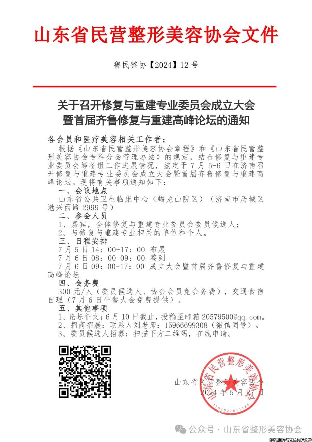 根據(jù)《山東省民營(yíng)整形美容協(xié)會(huì)章程》和《山東省民營(yíng)整形美容協(xié)會(huì)專(zhuān)科分會(huì)管理辦法》的規(guī)定,結(jié)合修復(fù)與重建專(zhuān)業(yè)委員會(huì)籌備組工作進(jìn)展情況,茲定于7月5-6日在濟(jì)南召開(kāi)修復(fù)與重建專(zhuān)業(yè)委員會(huì)成立大會(huì)暨首屆齊魯修復(fù)與重建高峰論壇。現(xiàn)將有關(guān)事項(xiàng)通知如下: