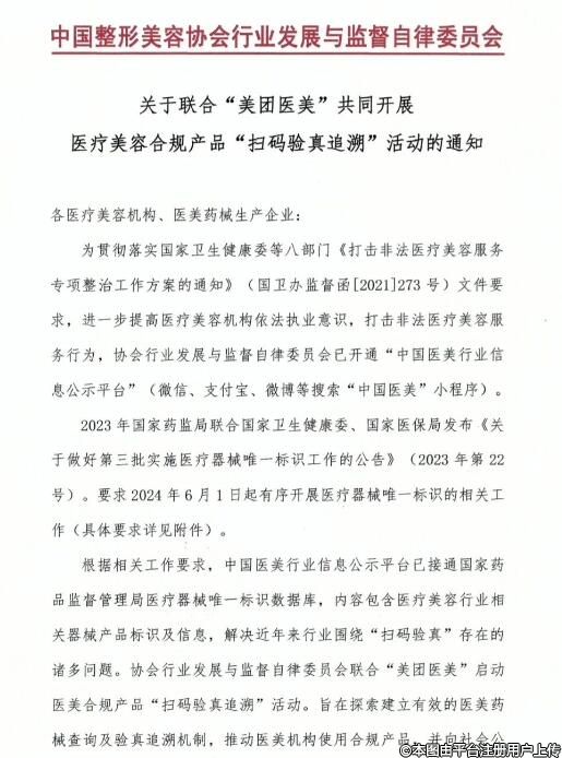 關(guān)于聯(lián)合“美團醫(yī)美”共同開展醫(yī)療美容合規(guī)產(chǎn)品“掃碼驗真追溯”活動的通知