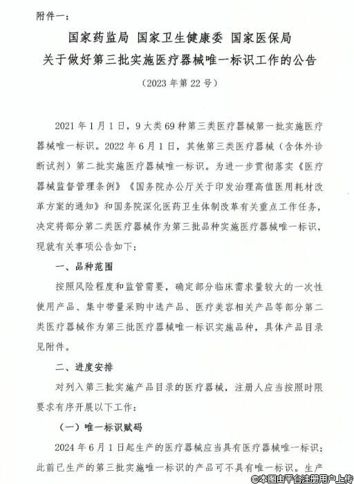 按照風(fēng)險程度和監(jiān)管需要,確定部分臨床需求量較大的一次性使用產(chǎn)品、集中帶量采購中選產(chǎn)品、醫(yī)療美容相關(guān)產(chǎn)品等部分第二類醫(yī)療器械作為第三批醫(yī)療器械唯一標(biāo)識實施品種,具體產(chǎn)品目錄見附件。