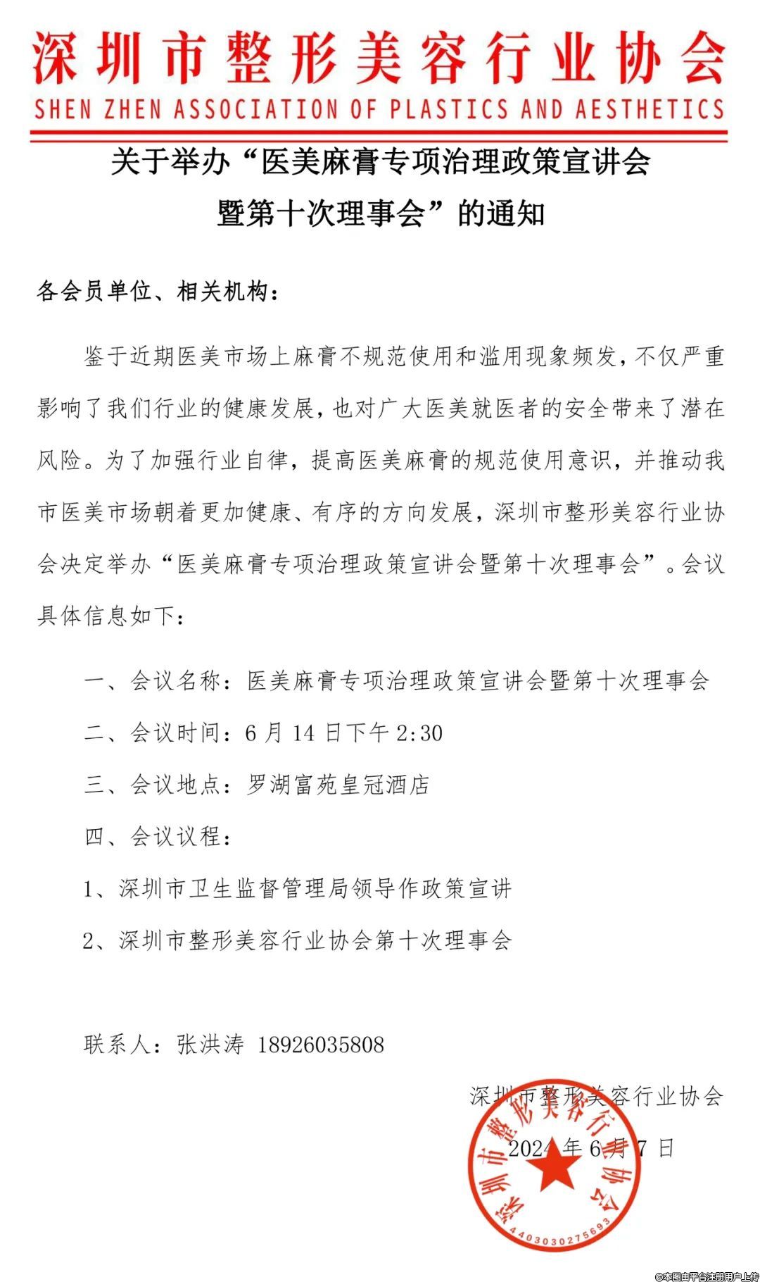 鑒于近期醫(yī)美市場上麻膏不規(guī)范使用和濫用現(xiàn)象頻發(fā),不僅嚴(yán)重影響了我們行業(yè)的健康發(fā)展,也對廣大醫(yī)美就醫(yī)者的安全帶來了潛在風(fēng)險。為了加強(qiáng)行業(yè)自律,提高醫(yī)美麻膏的規(guī)范使用意識,并推動我市醫(yī)美市場朝著更加健康、有序的方向發(fā)展,深圳市整形美容行業(yè)協(xié)會決定舉辦“醫(yī)美麻膏專項(xiàng)治理政策宣講會暨第十次理事會”。