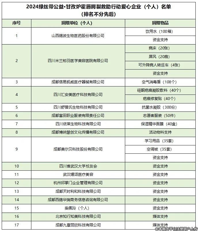 成都市醫(yī)療美容產(chǎn)業(yè)協(xié)會組織17家愛心企業(yè)開展“2024綠絲帶公益·甘孜爐霍唇腭裂救助行動”