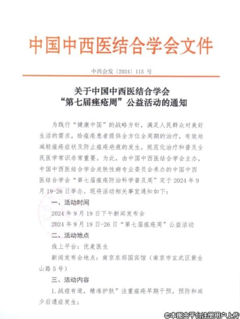 為踐行“健康中國”的戰(zhàn)略方針,滿足人民群眾對美好生活的需求,給痤瘡患者提供全方位全周期的治療,有效地減輕痤瘡癥狀及防止痤瘡疤痕的發(fā)生,規(guī)范化治療和普及全民醫(yī)學常識非常重要。為此,由中國中西醫(yī)結(jié)合學會主辦,中國中西醫(yī)結(jié)合學會皮膚性病專業(yè)委員會承辦的中國中西醫(yī)結(jié)合學會“第七屆痤瘡防治科學普及周”定于2024年9月19日-26日舉辦。