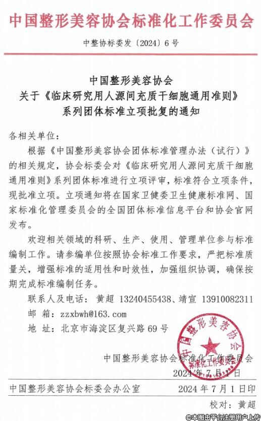 中國整形美容協(xié)會關(guān)于《臨床研究用人源間充質(zhì)干細(xì)胞通用準(zhǔn)則》系列團體標(biāo)準(zhǔn)立項批復(fù)的通知