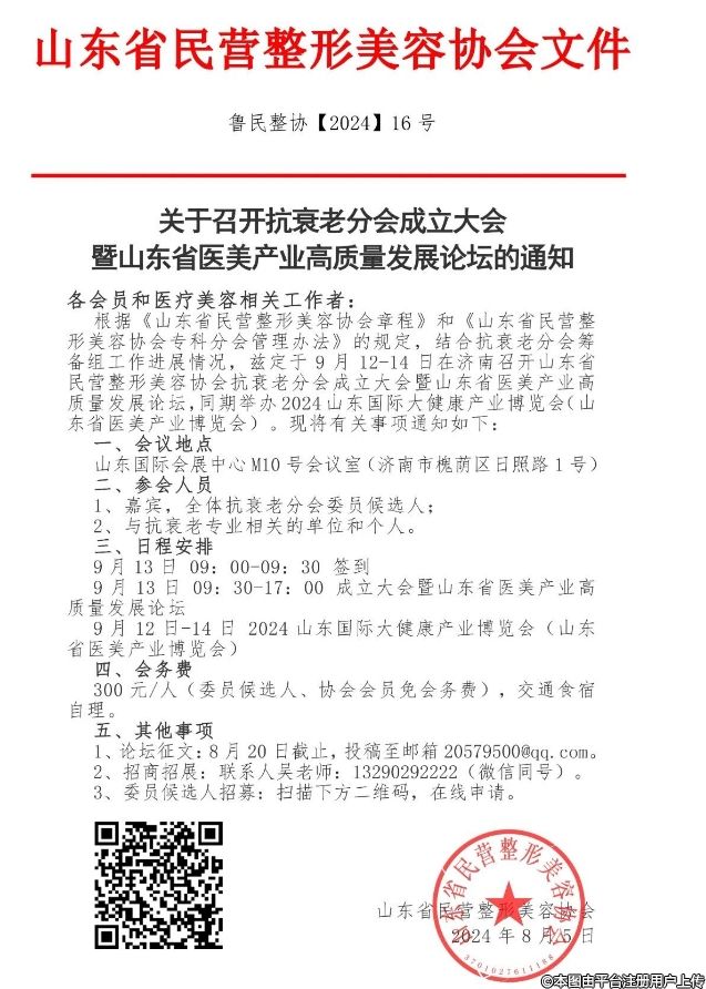 山東省民營整形美容協(xié)會(huì)抗衰老分會(huì)成立大會(huì)暨山東省醫(yī)美產(chǎn)業(yè)高質(zhì)量發(fā)展論壇將于9月13日在濟(jì)南召開