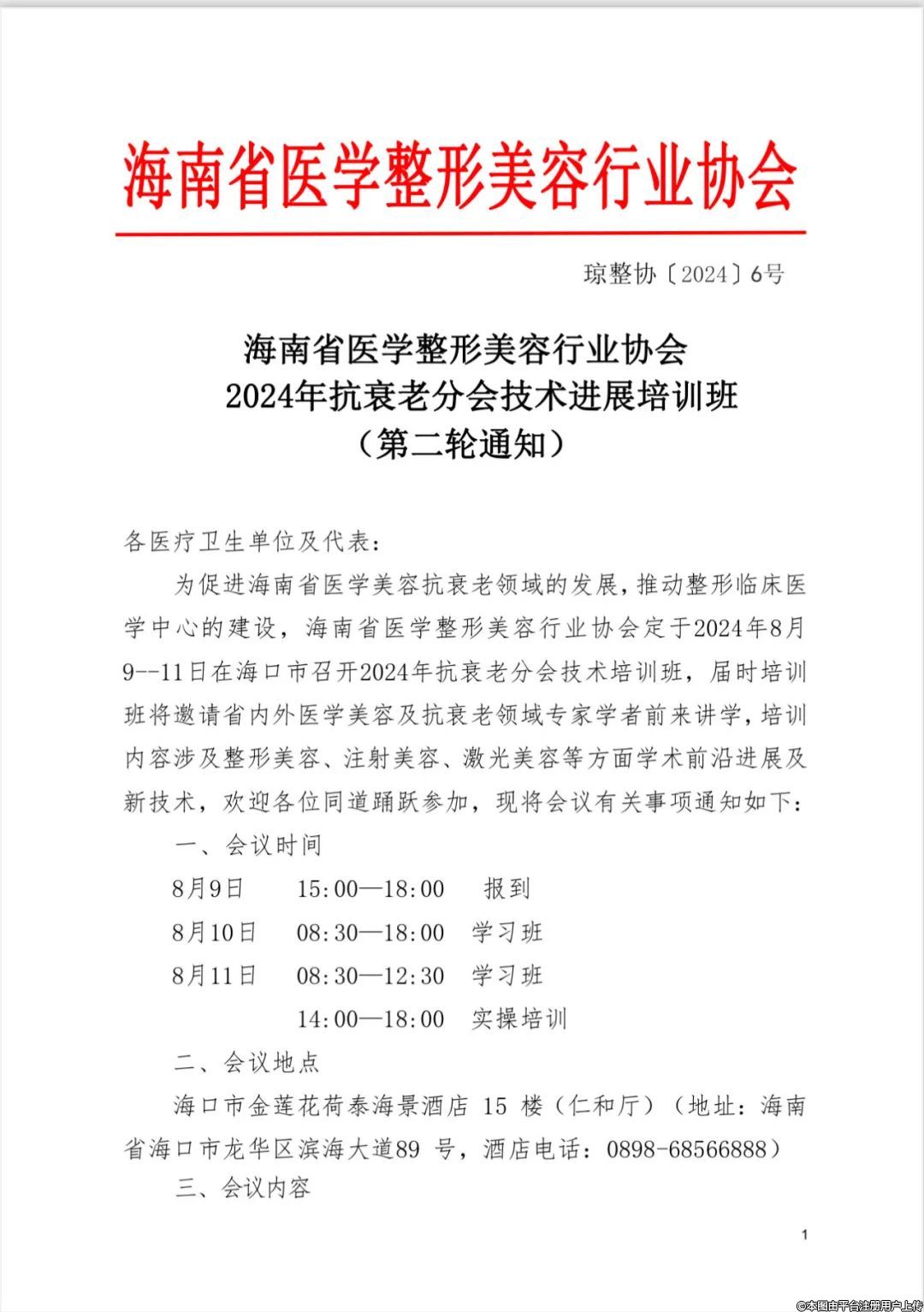 2024瓊整協(xié)抗衰老技術(shù)進(jìn)展培訓(xùn)班將于8月10日在金蓮花荷泰海景酒店召開(kāi)