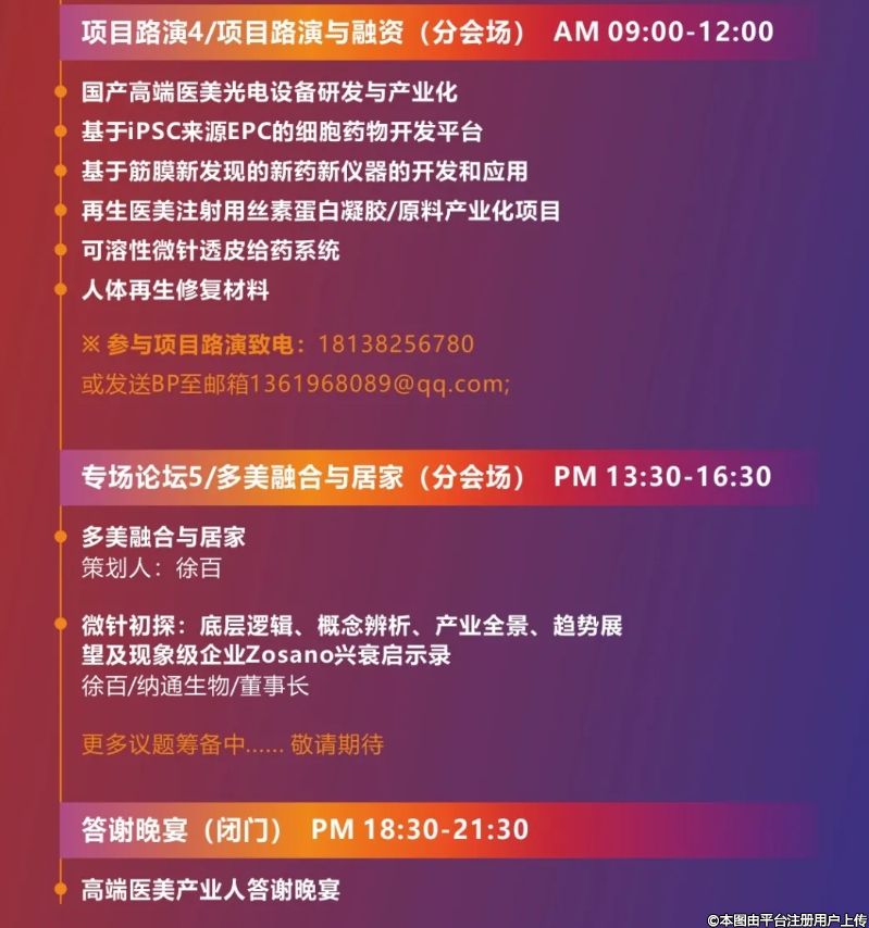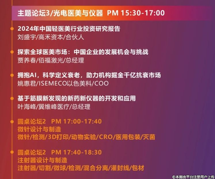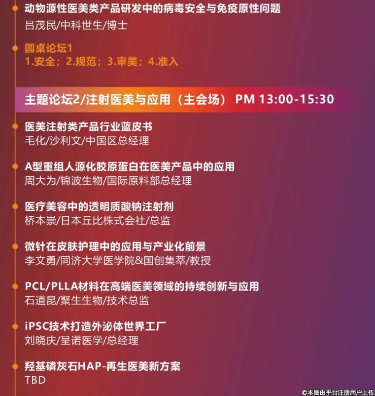 據(jù)悉,本次大會(huì)將從安全規(guī)范與市場(chǎng)準(zhǔn)入、注射醫(yī)美與應(yīng)用、光電醫(yī)美與儀器、多醫(yī)美融合與創(chuàng)新、項(xiàng)目路演與融資等六大領(lǐng)域開(kāi)展論壇,進(jìn)行深入研討與交流,加速?lài)?guó)內(nèi)醫(yī)美生態(tài)圈建設(shè),全面、深度剖析、展望高端醫(yī)美器械的現(xiàn)狀與未來(lái),助力醫(yī)美賽道健康與穩(wěn)定發(fā)展。其中安全規(guī)范與市場(chǎng)準(zhǔn)入論壇將會(huì)邀請(qǐng)相關(guān)主管部門(mén)領(lǐng)導(dǎo)解析政策,同時(shí)圍繞安全、合規(guī)、注冊(cè)、動(dòng)物實(shí)驗(yàn)、檢測(cè)、準(zhǔn)入等層面進(jìn)行探討;注射醫(yī)美與應(yīng)用論壇則緊扣醫(yī)美材料、器械和醫(yī)美方案進(jìn)行研究;光電醫(yī)美與儀器論壇將深入探討光電醫(yī)美產(chǎn)業(yè)市場(chǎng)發(fā)展最新趨勢(shì)和機(jī)會(huì),并就微針和注射器的設(shè)計(jì)與制造全產(chǎn)業(yè)鏈展開(kāi)討論;多醫(yī)美融合與創(chuàng)新論壇將就多醫(yī)美與智能家居領(lǐng)域展開(kāi)分析與展望;而項(xiàng)目路演與融資將搭建醫(yī)美產(chǎn)業(yè)企業(yè)與投資機(jī)構(gòu)交流平臺(tái),促使資本與產(chǎn)業(yè)融合,助力醫(yī)美產(chǎn)業(yè)進(jìn)一步高速發(fā)展,目前佰福激光、呈諾醫(yī)學(xué)、翼維峰醫(yī)療、繡麗醫(yī)藥、新世元生物、藍(lán)皓生物等超過(guò)10家企業(yè)已報(bào)名參與。