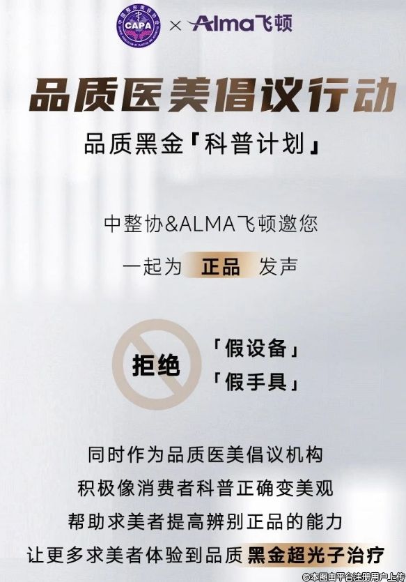 為了提高光子嫩膚臨床滿意度,交付黑金超光子更好臨床效果,中國整形美容協(xié)會聯(lián)合Alma飛頓共同發(fā)起品質(zhì)醫(yī)美倡議行動【品質(zhì)黑金科普計劃】,我們誠摯邀請您一起為正品發(fā)聲,拒絕使用假設備、假手具!