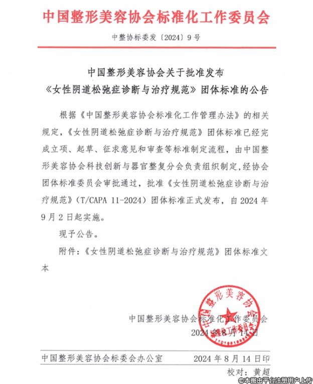 根據(jù)《中國整形美容協(xié)會標(biāo)準(zhǔn)化工作管理辦法》的相關(guān)規(guī)定,《女性陰道松弛癥診斷與治療規(guī)范》團(tuán)體標(biāo)準(zhǔn)已經(jīng)完成立項、起草、征求意見和審查等標(biāo)準(zhǔn)制定流程,由中國整形美容協(xié)會科技創(chuàng)新與器官整復(fù)分會負(fù)責(zé)組織制定,經(jīng)協(xié)會團(tuán)體標(biāo)準(zhǔn)委員會審批通過,批準(zhǔn)《女性陰道松弛癥診斷與治療規(guī)范》(T/CAPA 11-2024)團(tuán)體標(biāo)準(zhǔn)正式發(fā)布,自2024年9月2日起實(shí)施。
