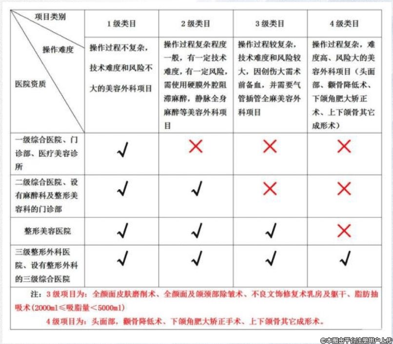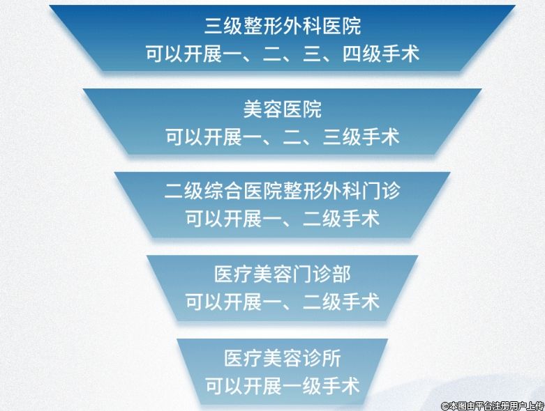 即醫(yī)療美容診所、設(shè)有醫(yī)療美容科或整形外科的一級綜合醫(yī)院可開展一級美容項(xiàng)目,設(shè)有麻醉科及醫(yī)療美容科或整形外科的門診部,或設(shè)有醫(yī)療美容科或整形外科的二級綜合醫(yī)院可開展一、二級醫(yī)療美容項(xiàng)目;美容醫(yī)院可開展一、二、三級醫(yī)療美容項(xiàng)目;三級整形外科醫(yī)院或設(shè)有整形外科或醫(yī)療美容科的三級綜合醫(yī)院可開展二、三、四級整形美容項(xiàng)目,可開展骨降低術(shù)、下頜角肥大矯正術(shù)、上下頜骨其他成形術(shù)等四級高難度手術(shù)。