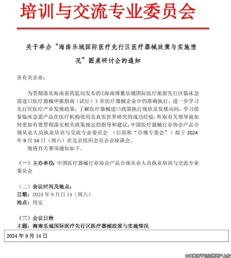 關(guān)于舉辦“海南樂城國際醫(yī)療先行區(qū)醫(yī)療器械政策與實(shí)施情況”圓桌研討會的通知