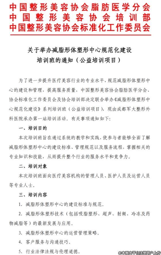 為了進一步提升醫(yī)療美容行業(yè)的專業(yè)水平,規(guī)范減脂形體塑形中心的建設和管理,提高服務質量,中國整形美容協(xié)會脂肪醫(yī)學分會協(xié)會標準化工作委員會及協(xié)會培訓部決定聯(lián)合舉辦《減脂形體塑形中心規(guī)范化建設》系列培訓班(公益培訓項目),現(xiàn)由成都軍大整形外科醫(yī)院承辦第一站培訓活動。有關事項通知如下: