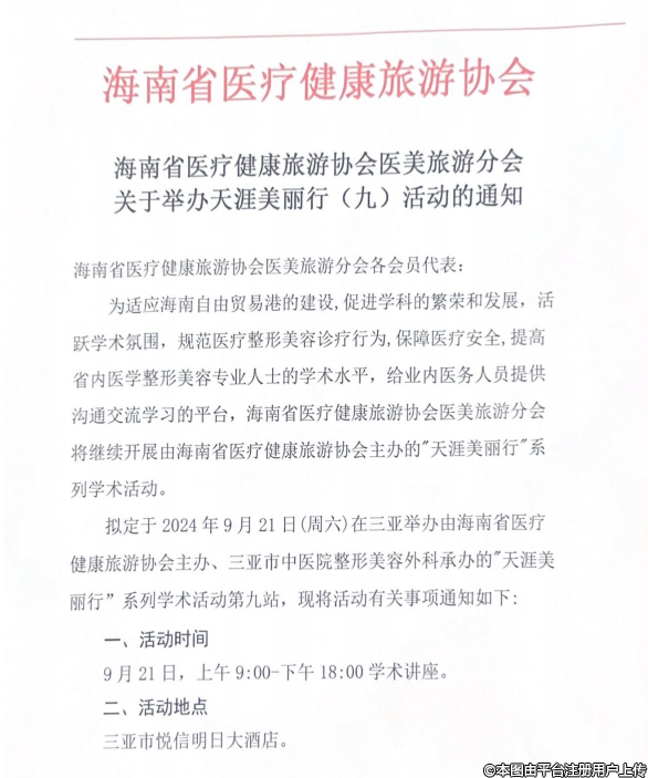 擬定于2024年9月21日(周六)在三亞舉辦由海南省醫(yī)療健康旅游協(xié)會(huì)主辦、三亞市中醫(yī)院整形美容外科承辦的"天涯美麗行”系列學(xué)術(shù)活動(dòng)第九站,現(xiàn)將活動(dòng)有關(guān)事項(xiàng)通知如下