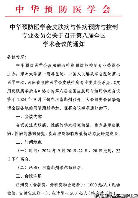 中華預(yù)防醫(yī)學(xué)會(huì)皮膚病與性病預(yù)防與控制專業(yè)委員會(huì)關(guān)于召開第八屆全國(guó)學(xué)術(shù)會(huì)議的通知