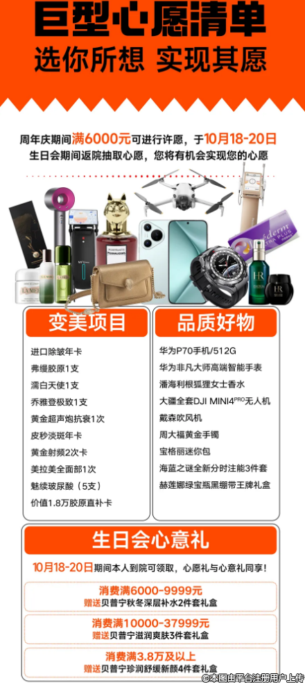周年慶期間消費(fèi)滿6000元,即有機(jī)會(huì)抽取進(jìn)口淡皺年卡/喬雅登玻尿酸/皮秒淡斑/濡白天使/華為p70手機(jī)/周大福黃金手鐲等超豪華心愿清單!隨便抽中一個(gè)都爽到爆!