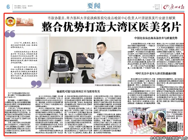10月11日,廣州日報刊登《整合優(yōu)勢打造大灣區(qū)醫(yī)美名片》一文,專訪廣州市政協(xié)委員、南方醫(yī)科大學(xué)皮膚病醫(yī)院化妝品檢測中心負(fù)責(zé)人葉理就醫(yī)美行業(yè)建言獻策。現(xiàn)轉(zhuǎn)載全文報道,以饗讀者。