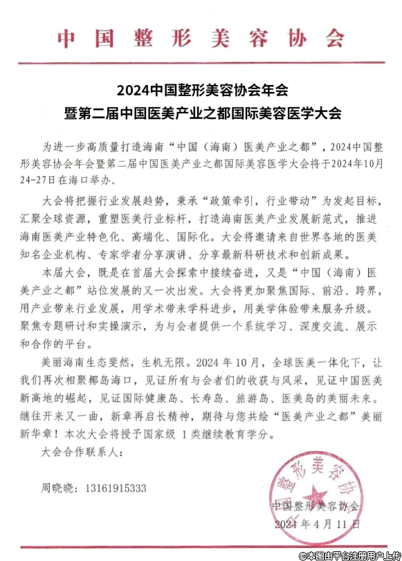 為進一步高質(zhì)量打造海南“中國(海南)醫(yī)美產(chǎn)業(yè)之都”,2024中國整形美容協(xié)會年會暨第二屆中國醫(yī)美產(chǎn)業(yè)之都國際美容醫(yī)學大會將于2024年10月24-27日在海口舉辦。