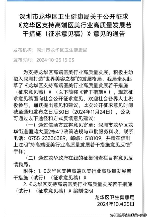 深圳市龍華區(qū)發(fā)布《龍華區(qū)支持高端醫(yī)美行業(yè)高質(zhì)量發(fā)展若干措施(征求意見稿)》,公開征求意見