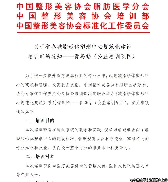 為了進(jìn)一步提升醫(yī)療美容行業(yè)的專業(yè)水平,規(guī)范減脂形體塑形中心的建設(shè)和管理,提高服務(wù)質(zhì)量,中國整形美容協(xié)會(huì)脂肪醫(yī)學(xué)分會(huì)協(xié)會(huì)標(biāo)準(zhǔn)化工作委員會(huì)及協(xié)會(huì)培訓(xùn)部決定聯(lián)合舉辦《減脂形體塑形中心規(guī)范化建設(shè)》系列培訓(xùn)班--青島站(公益培訓(xùn)項(xiàng)目)。有關(guān)事項(xiàng)通知如下: